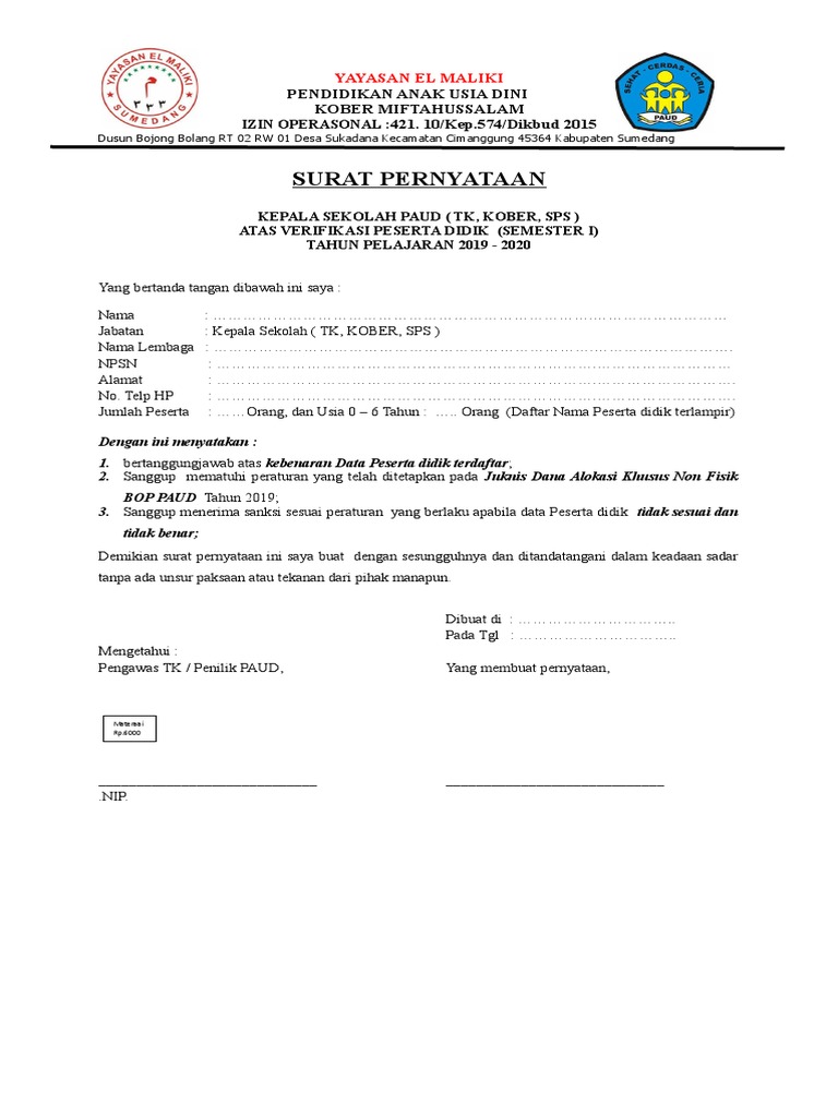 Contoh surat pernyataan sekolah berbagai pernyataan tertulis memang masih sangat sering dipergunakan hingga saat ini. Surat pernyataan kebenaran data dan keabsahan dokumen. Sptjm surat pernyataan tanggung jawab mutlak. 9 surat pernyataan kepala sekolah (bermaterai) yang menyatakan sanggup melaksanakan jam belajar mulai pukul 06.30; Artikelberita dan gambar tentang kehidupan dan dunia pendidikan. 7 contoh surat pemberitahuan untuk orang tua murid surat pendidikan penuaan. Salah satu dokumen yang harus di upload/unggah pada saat melakukan pendaftaran. 8 tidak menempati atau menggunakan fasilitas gedung milik pemerintah, rumah toko/rumah kantor atau pada lahan yang bermasalah; • klik tombol untuk mengupload surat pernyataan dalam format pdf. Surat pernyataan kebenaran dan keabsahan dokumen bermaterai 6000; Qurratu aini tempat, tgl lahir : Contoh surat pernyataan kepala sekolah untuk akreditasi have an image associated with the other. Surat pernyataan kebenaran kepala sekolah.